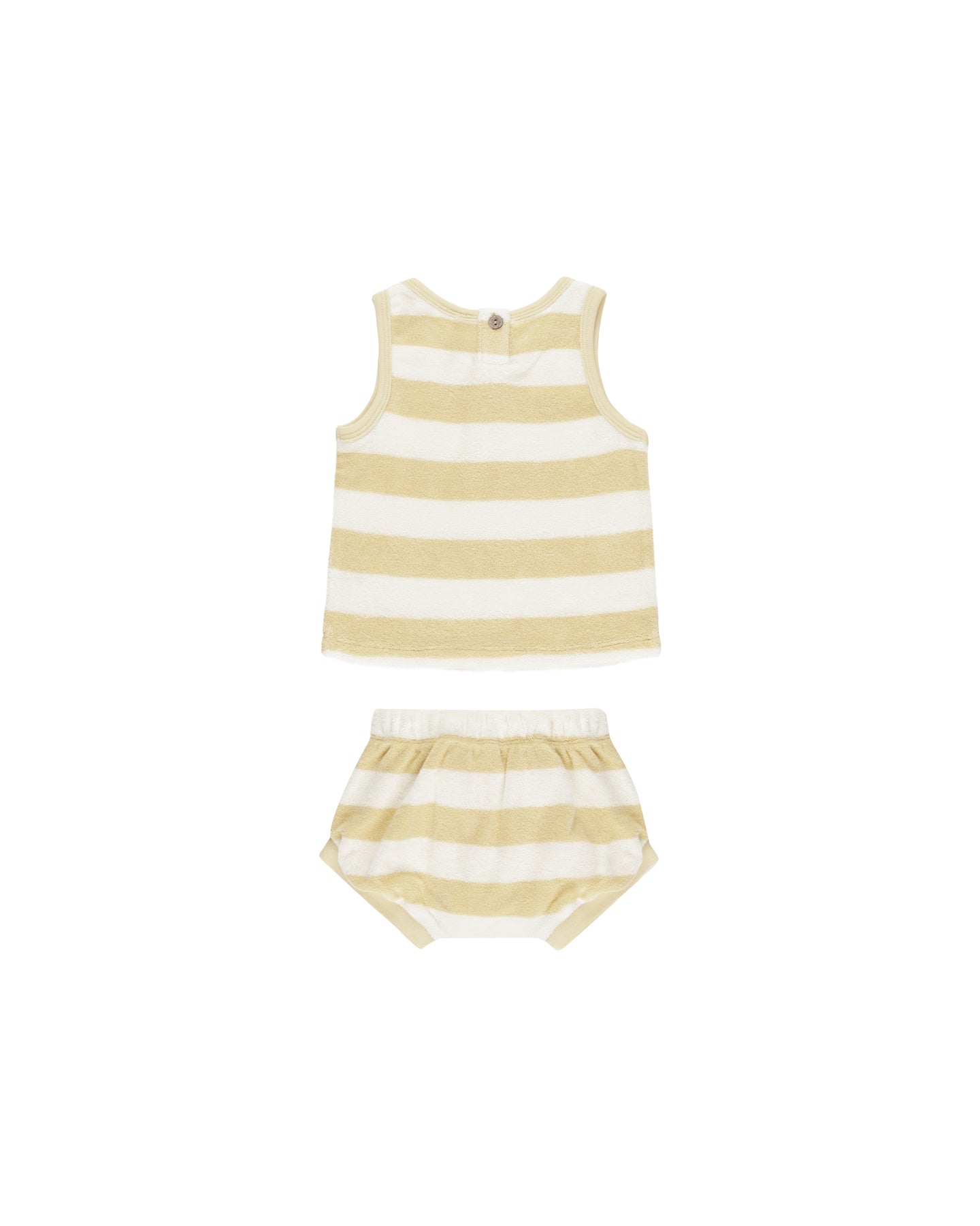 This Terry Tank + Short Set is an easy warm-weather go-to. The tank features a snap-back closure for easy wear and the short features an elastic waist, drawstring, and ribbed leg openings for a perfect fit.