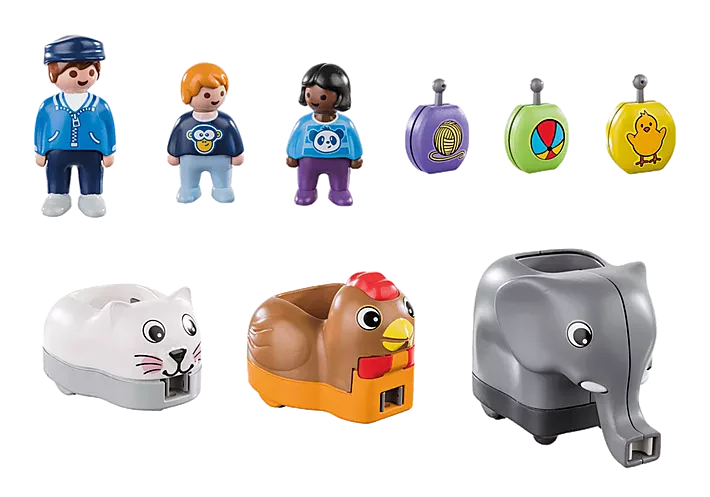 Fun and learning for little explorers. Pushing, sticking, assigning: There is always something new to discover on the fun ride with the Animal Train. The animal coaches travel individually or can be combined to form a long train. What does the cat play with and what does the elephant eat? By assigning the pictures to the various animals, toddlers can tell their own little stories. With small steps into the big world of PLAYMOBIL. The play system of PLAYMOBIL 1.2.3 is divided into three learning stages that build on each other: Easy Start, First Challenge and Little Expert. Each learning stage playfully promotes the child's development. Varied play themes and functions individually promote creativity, fine motor skills, language development, cognitive understanding and social competence.