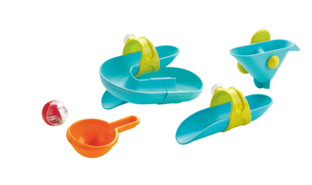 Rumble, tumble, splish, splash! Make bath time a rollicking adventure. The water ball, with cheerfully rattling integrated marbles, zips around the spiral curve, plops into the seesaw bucket and tumbles out on the other side. Children can design the ball's course themselves, as the water track elements can be arranged endless different ways. Water can also be filled into the tracks with the ladle.Contents: Contents: 1 water ball, 1 ladle, 1 spiral curve ramp, 1 seesaw bucket, and 1 track/ramp, each piece includes suction cups to attach to the tub or tile (made of phthalate-free PP-plastic). Perfect for children ages 3 years and up. Dimensions: tracks l 8“ x w 6“ x h 5“, water ball-Ø 2“. Compatible with all bathtub ball track sets and accessories.