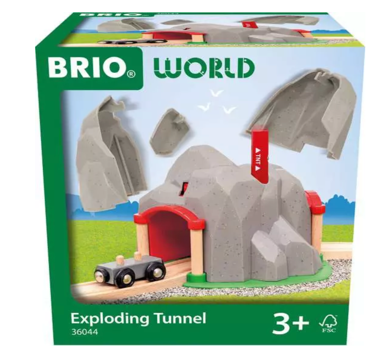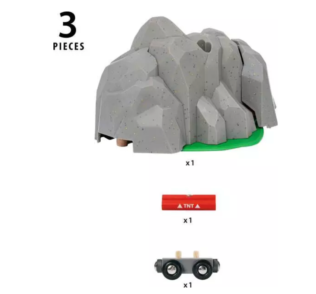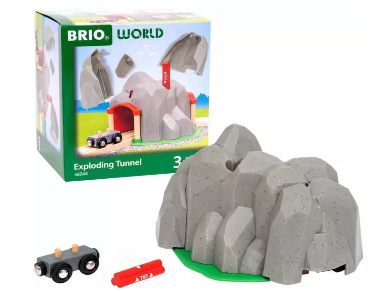 BOOM! Let’s blow open the mountain and drive on through with the 36044 Exploding Tunnel. This large mountain set with realistic stone-finish is a great addition to any BRIO world and conceals a hidden railway passage inside. Insert the TNT into the hole and watch as the mountain explodes to reveal the secret tunnel. Crafted from sturdy plastic and wooden pieces, this train tunnel interlocks easily with other BRIO World toys via the curved wooden track passing through it.