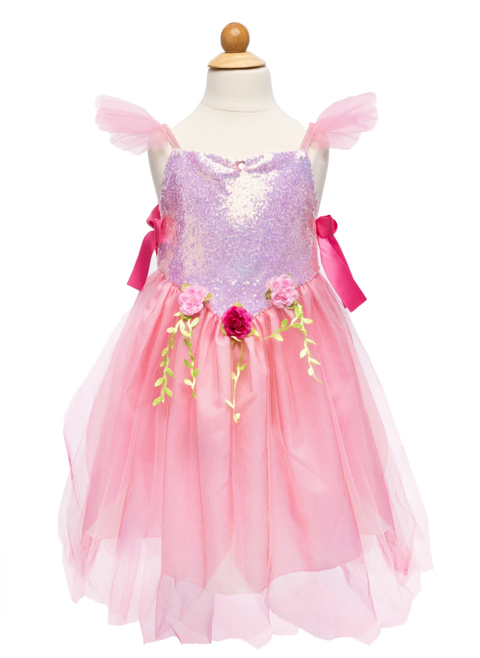 Tunics fit over the head and tie at the side, so they are extremely size flexible-making for the perfect gift! Flower accents add to the fairy finery, and heavy satin ribbons add contrasting colors. The topis adorned with an exquisite array of shimmering pink sequins. Petals are made from shimmering organza, tulle, and lining making the skirt full and fun!
