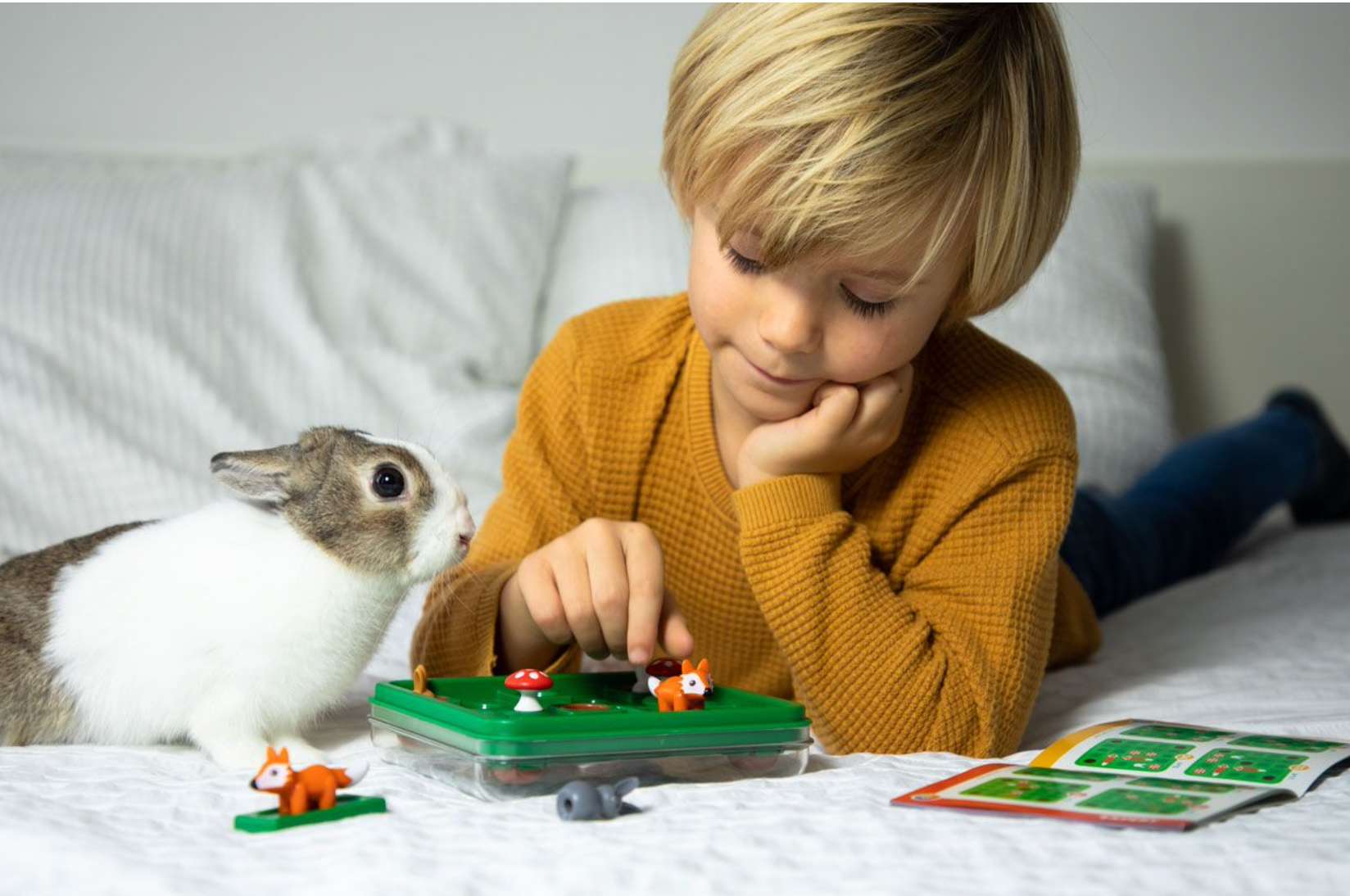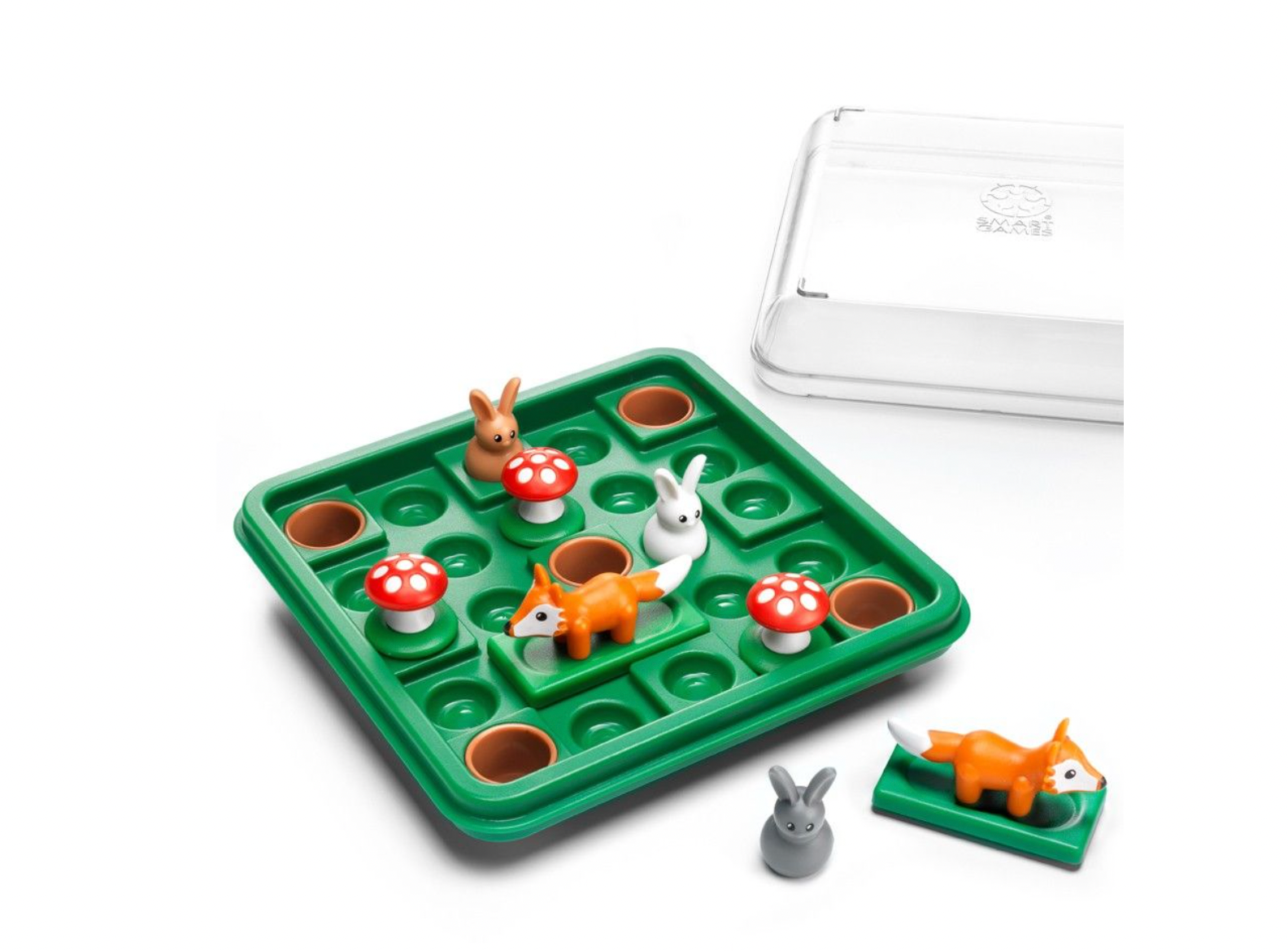 Portable game board with lid - perfect for travel, 3 rabbits, 3 mushrooms, 2 foxes, booklet with 60 challenges and solutions
