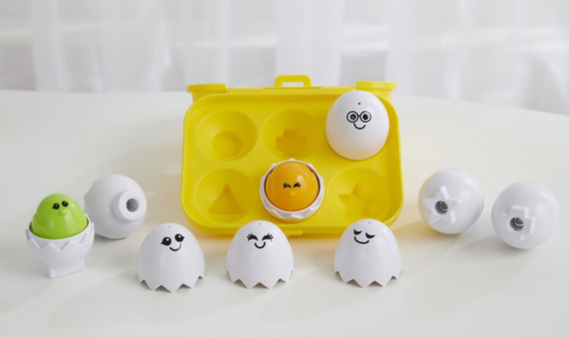 Little ones will have a ball with this toy! Lift off the eggshell to reveal a cute, colorful chick inside and press down on the chick to hear him squeak! The bottom of each egg contains a unique shape, sort the shapes to find the egg's home in the carton. For ages 12m and up.