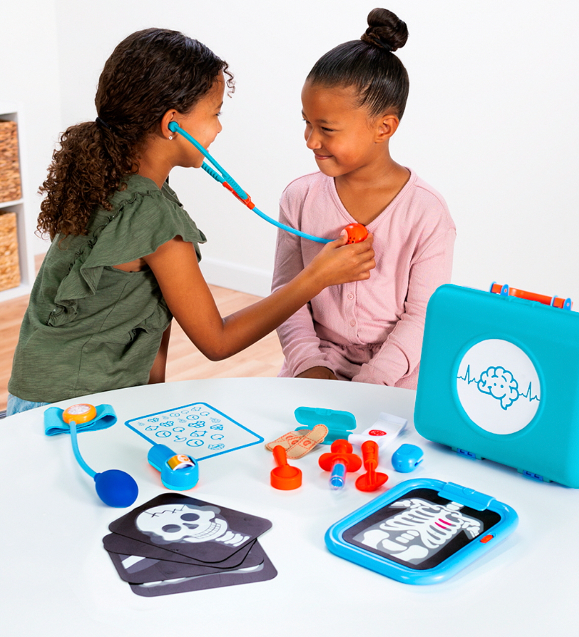 A thermometer, a finger oximeter, an otoscope, a reflex hammer, a stethoscope with real heartbeat sounds, a box of bandages, a syringe, health charts, a light-up x-ray panel, and more, all stored in a snap-shut case...