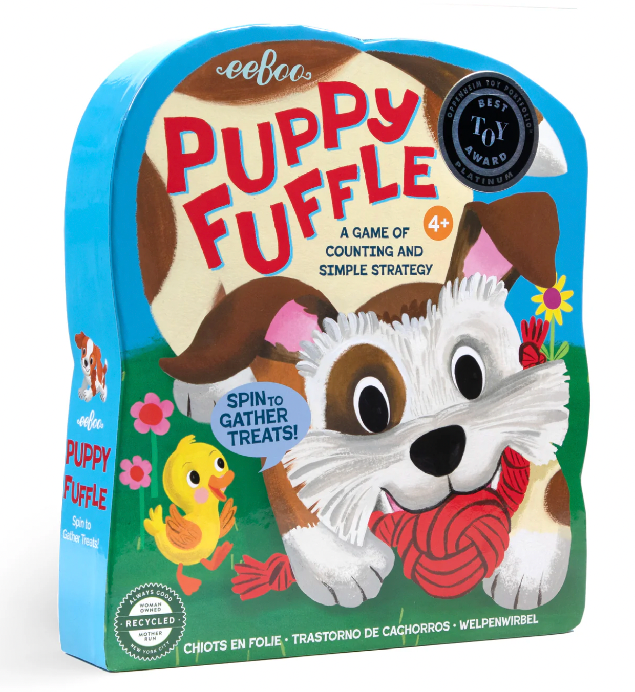 Puppy Fuffle, a great pre-school or family game. Spin to collect dog toys and treats from the board (and your opponent's stash)! A fast playing game that teaches simple counting, patience and problem solving. If you don’t win a round, don’t worry. Every dog has their day! Easy instructions and fun to play.