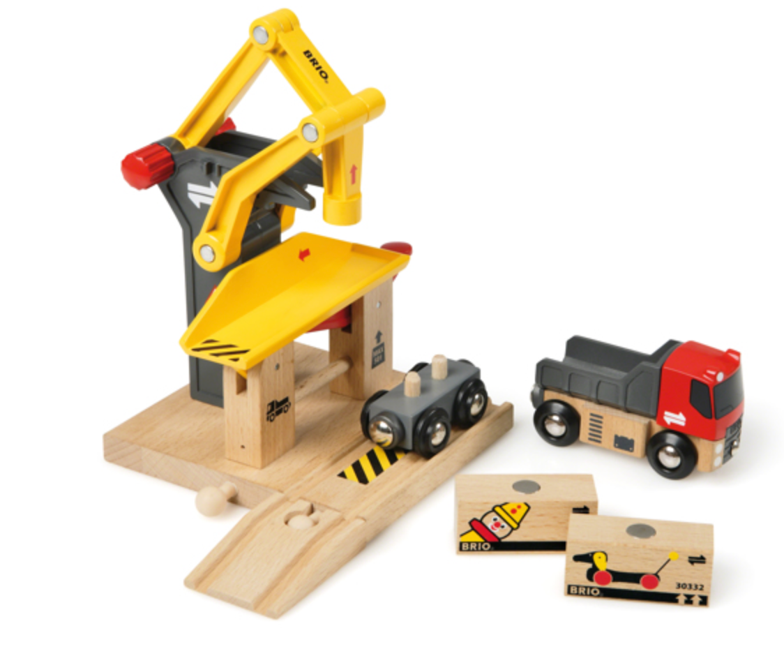 Lift and load action! Take the load off the wagon with the magnetic arm. Drop the load on the chute and press the button to slide it down onto the truck. Off it goes to deliver the cargo! Includes truck, wagon, load and ramp track.