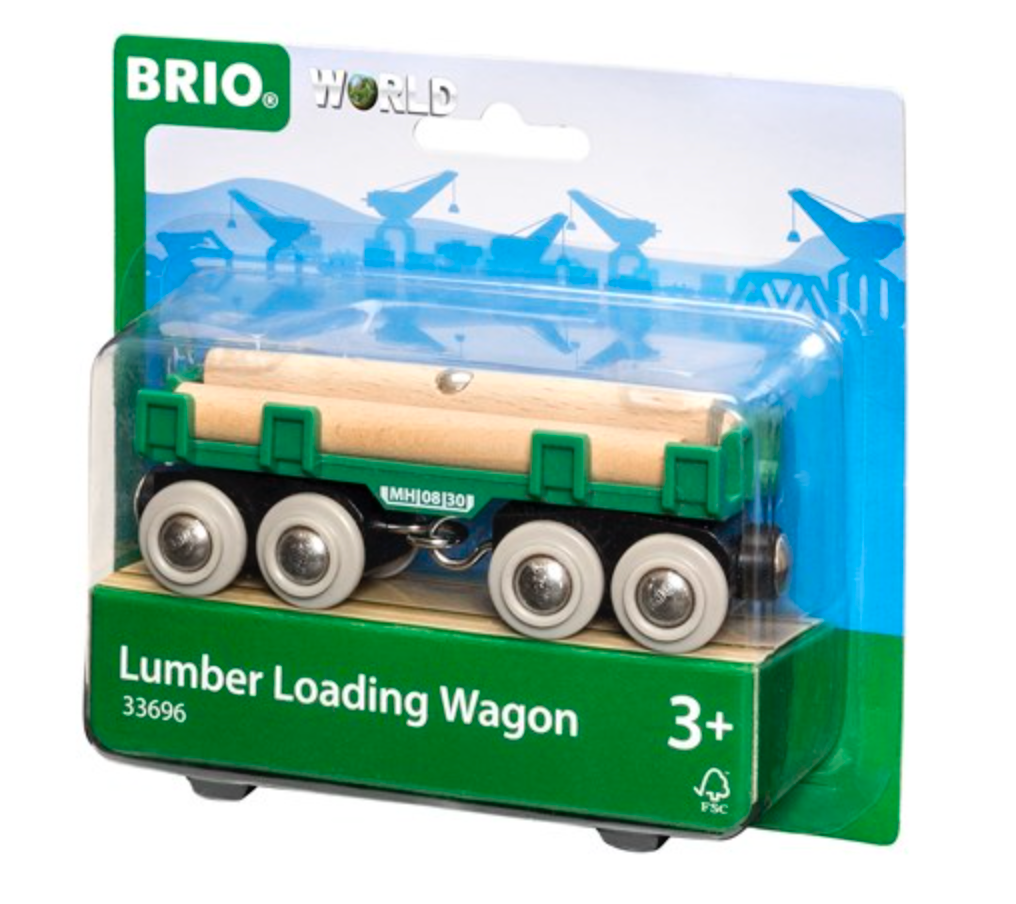 Every piece of lumber fits safely on the lumber loading wagon for railway and with eight wheels on the BRIO train track the ride from the forest is a breeze.