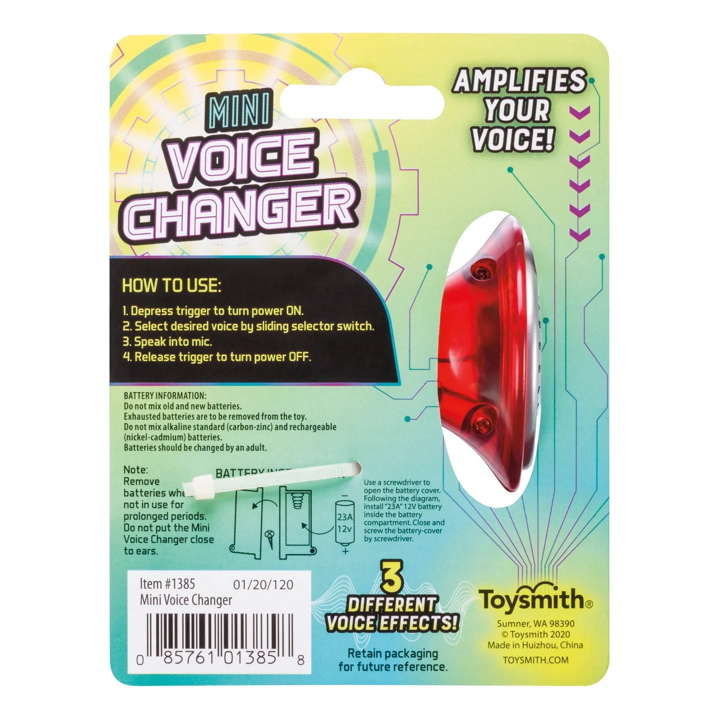 Miniature megaphone with voice-changing power. The Tech Gear 3.25-inch mini voice changer with flashing LED lights features 3 different voice effects, female, male, and robot, that can be combined in hundreds of different ways for unique voice creations. Batteries are required to use this electronic voice synthesizer toy. Comes in red or blue.