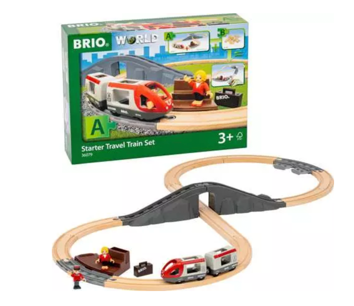 The 36079 Starter Travel Train Set is everything you need to create your first train set and begin your BRIO World adventures. The 22-piece railway set features a classic figure 8 track layout with a tunnel and bridge intersection at its centre and station platform for character play. Place the driver figure at the front of the travel train, pick up the passenger with her luggage waiting at the platform and begin your trip around BRIO’s iconic wooden tracks.