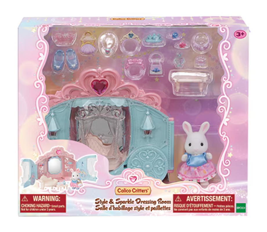 The Style & Sparkle Dressing Room comes with a beautiful, sparkly carriage, accessories and the Snow Rabbit girl dressed like a princess.The double doors of the carriage open to transform into a stylish room with lots of beautiful accessories and shelves to put them on.Comes with lots of accessories so you can enjoy creating various looks.The carriage has a handle so you can use it as a carry case for the figure and accessories.