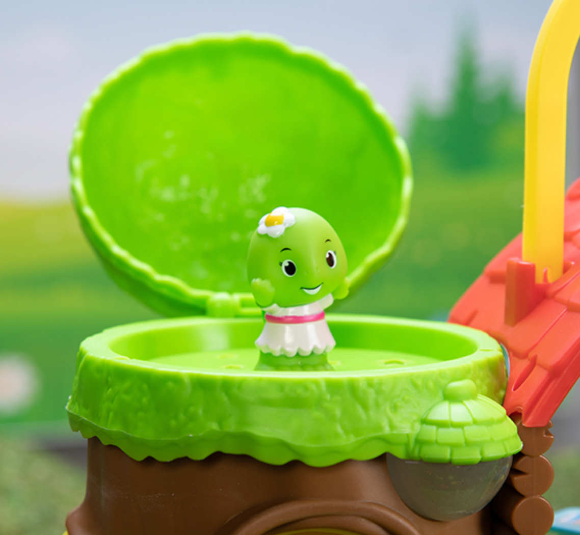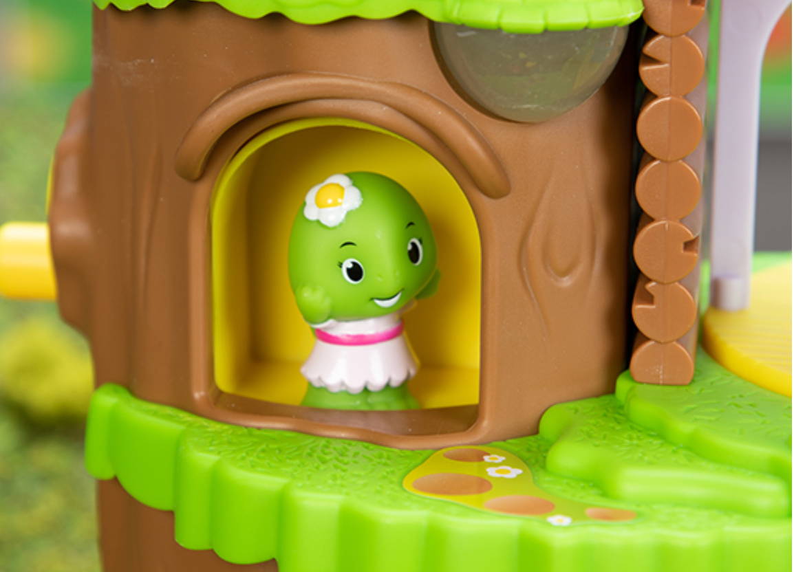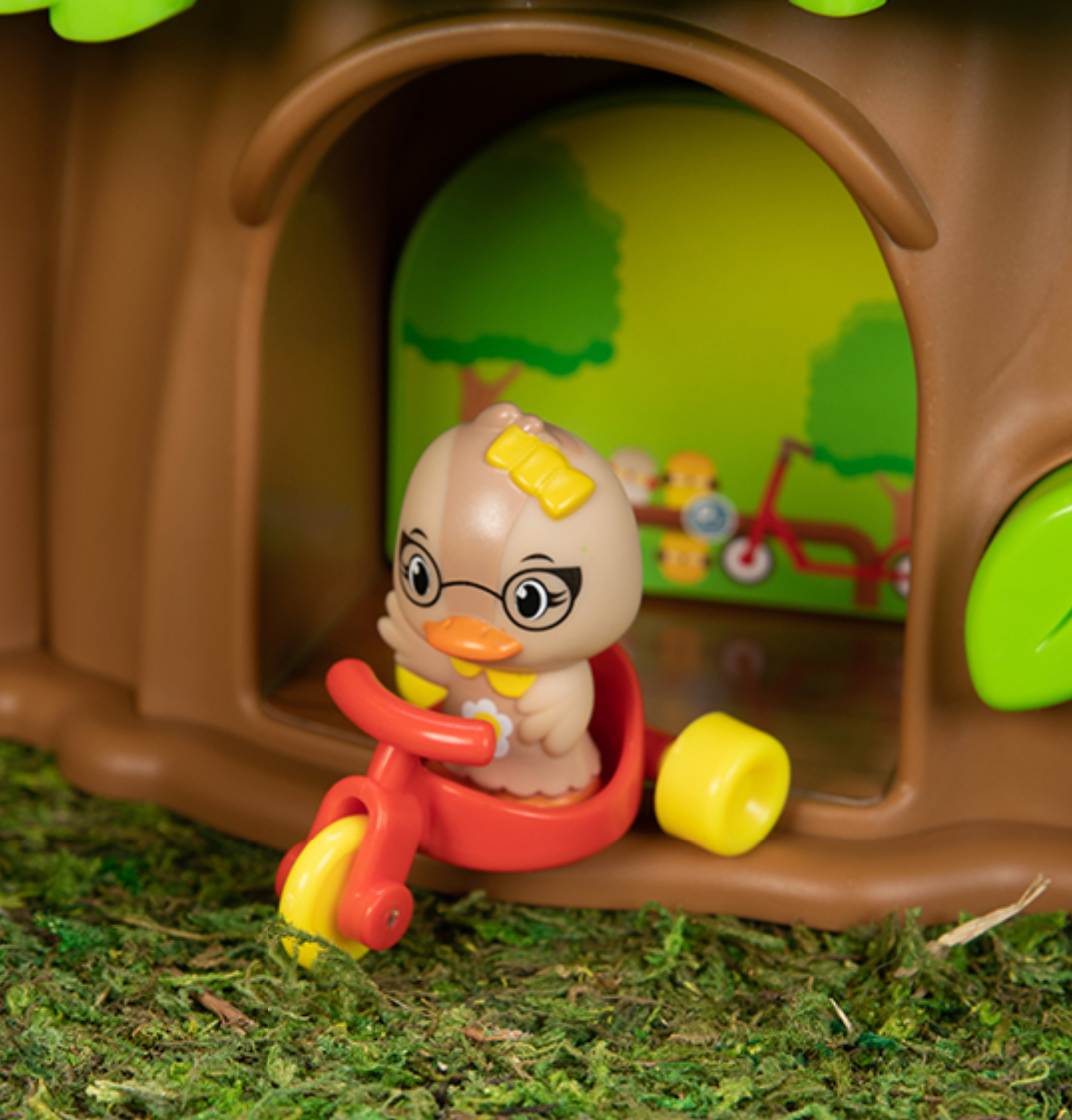 At lunchtime, the critters can climb up the stairs and pop open the treetop to reveal a lovely snack table. For recess, there's a spinning merry-go-round, a fun slide to slide down, and a tricycle stored underneath the classroom.