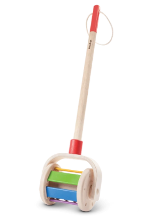 When the wheel turns, the wooden balls inside hit the panels creating fun sound.