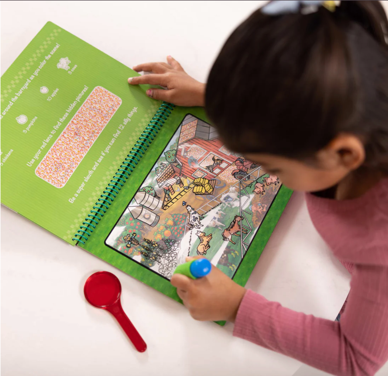 No-mess painting for kids! This exciting paint-with-water and seek-and-find activity book includes eight reusable pages, a refillable water pen, and red lens. Simply use the pen to color in each animal scene - details and vibrant color appear with every stroke! Let the page dry to erase the pictures and color it in again and again. Reveal hidden pictures with the water pen, then use the red lens to explore even more in the detailed scenes! The chunky-sized water pen and red lens are easy for kids to hold and store neatly right in the front cover, making this Deluxe Water WOW! an ideal travel activity book and travel toy for kids!