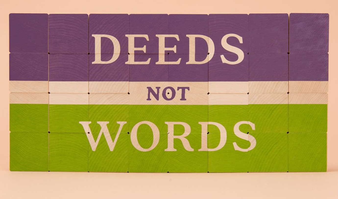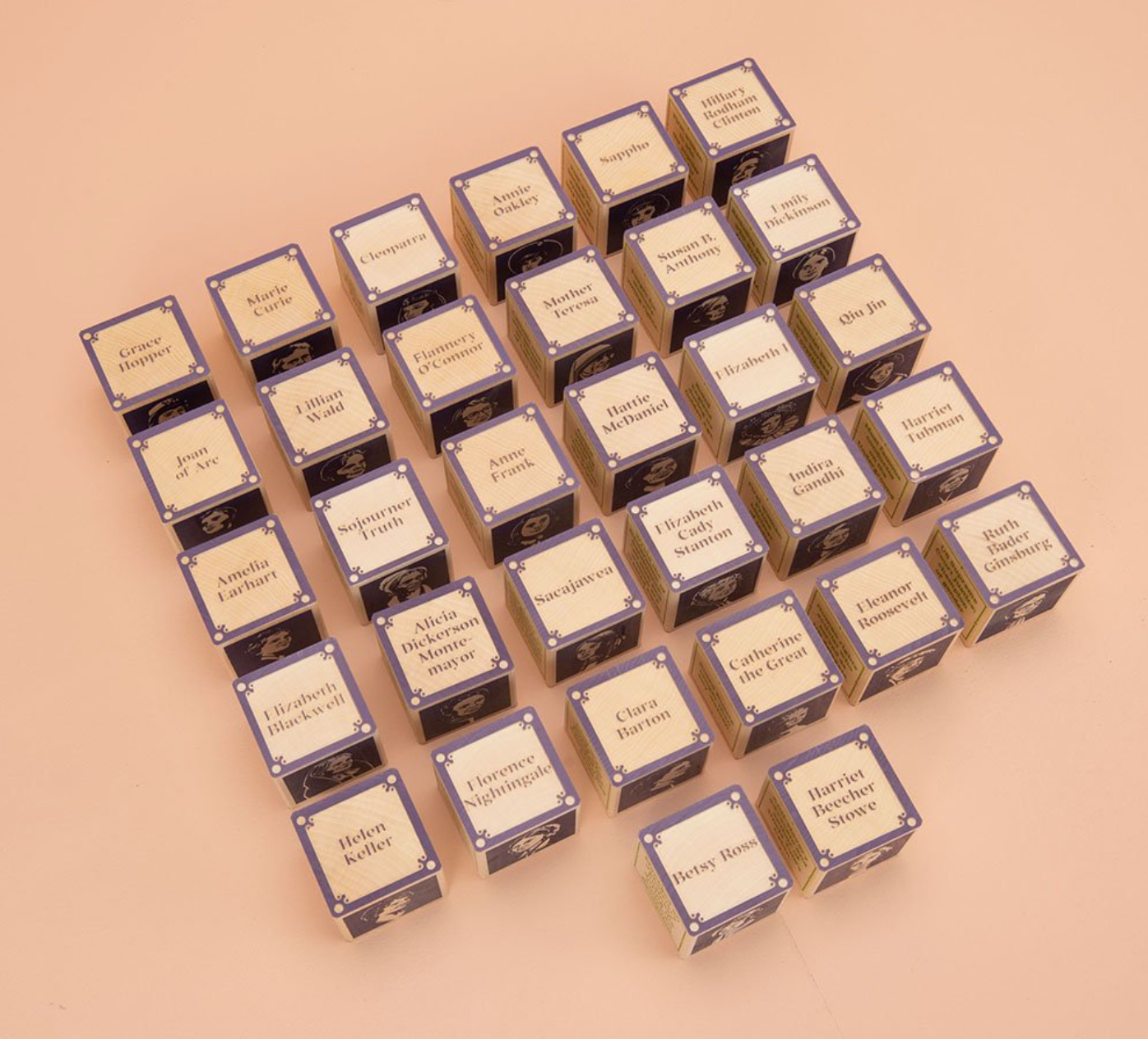 This 32 block hand crafted set features the faces of women who made a significant impact in the world. One embossed side per block reveals the woman's name. Two sides feature a quote and a description of each woman's worldly contribution. The puzzle spells out "Deeds Not Words" in purple and green, the colors of the suffragette movement. Store the blocks in a handsome wood tray. We printed a quote by Amelia Earhart in the interior of the tray. Let these blocks inspire you to greatness.