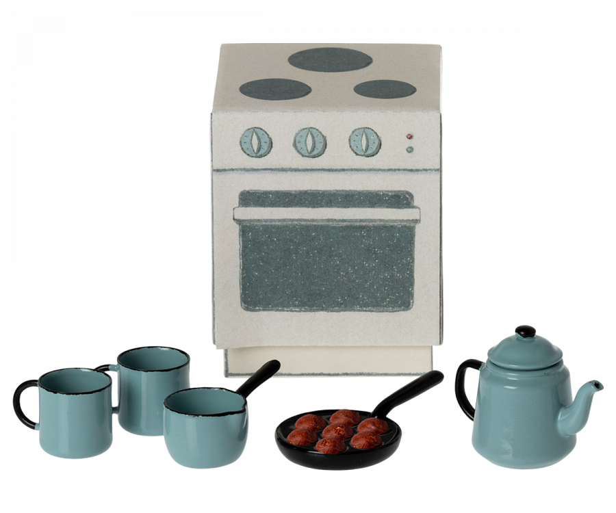 A miniature cooking set with all Madam Blue`s favorites. A can and two cups, a saucepan and a pan with delicious puff cakes which is a traditional scandinavian treat in the winter time. All these parts come in a paper box that looks like a stove.