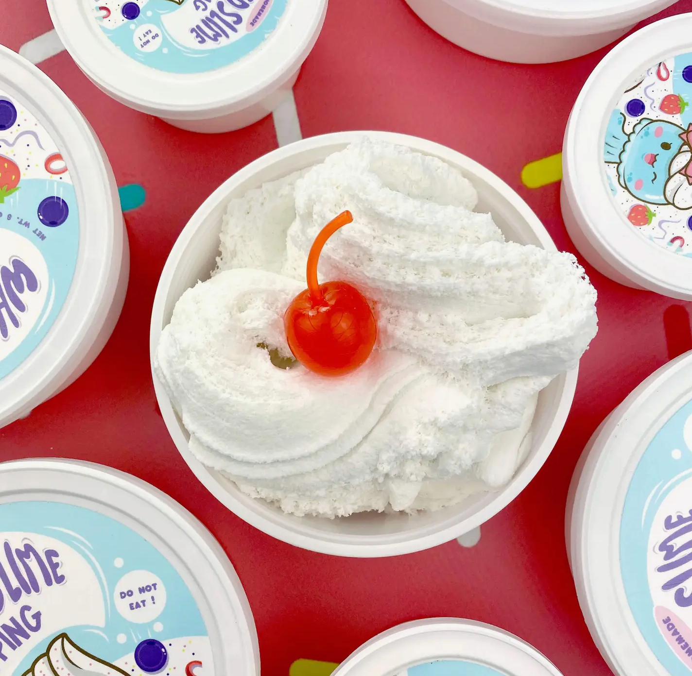 What a cool, slimy treat! Perfect for topping all of your delectable slime creations at home or add a little dollop to one of our ice cream pint slimes. Our famous "meringue" texture is buttery and spreadable yet feels so light & airy! Even better, it holds its shape indefinitely so it can be used to make "whipped cream swirls". It's also scented with a scrumptious light whipped cream fragrance that is complimentary if combined with other slimes! Each jar also comes with 1 "cherry on top"!