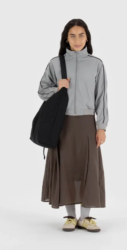 A slouchy, softly structured nylon bag with an adjustable strap. Interior zip pocket with a magnetic closure.