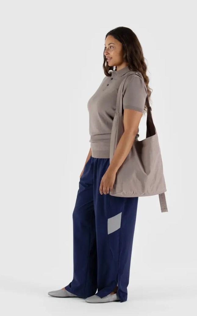 A slouchy, softly structured nylon bag with an adjustable strap. Interior zip pocket with a magnetic closure.