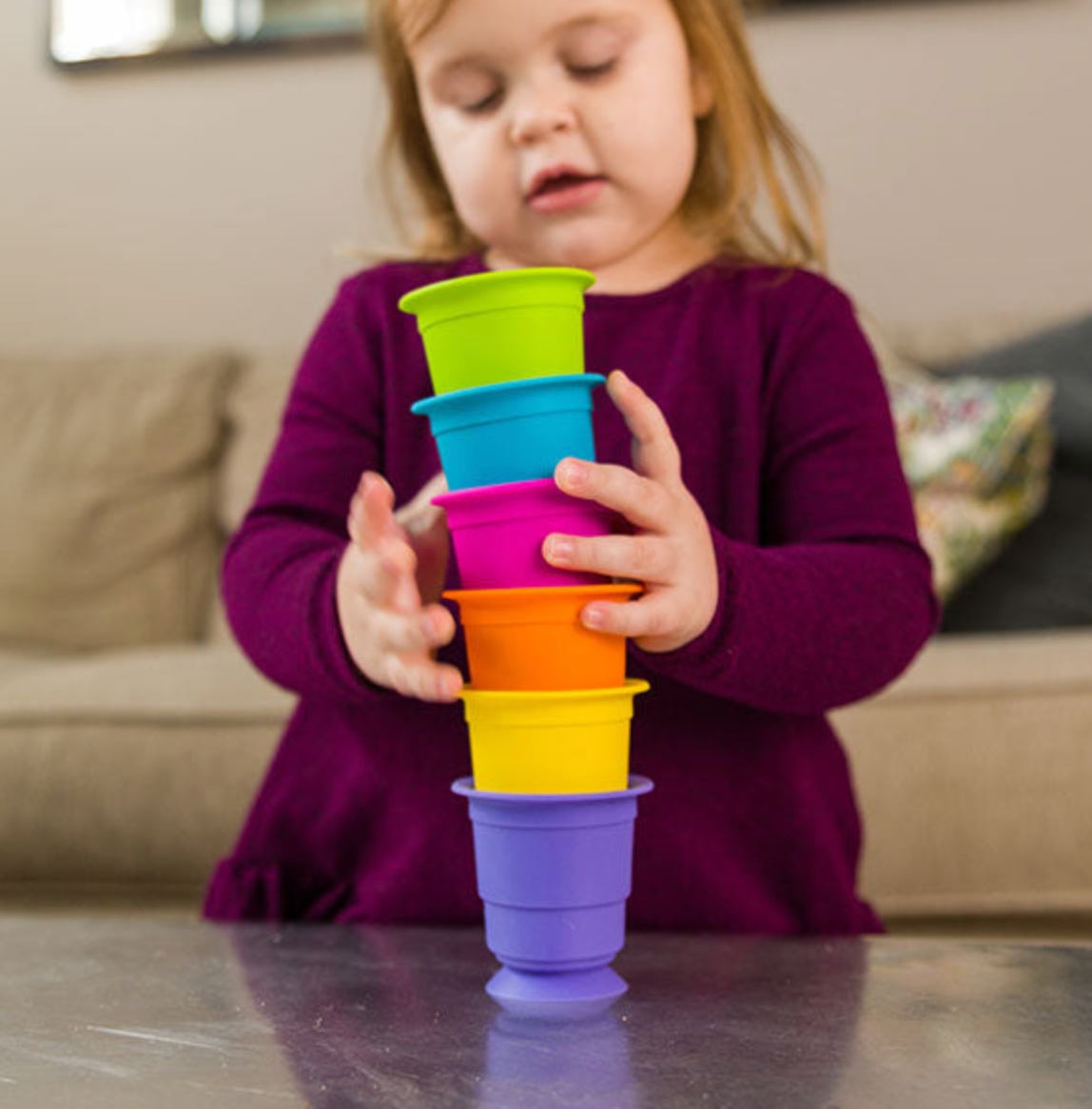 These dishwasher-safe silicone cups suction to tables, trays and other smooth surfaces are. Separate snacks in them, take them into the tub, bring them traveling. These open-ended play toys are endless fun!